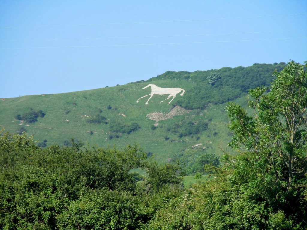 We packed up the tent and headed off back into Alfriston where we picked up the trail by the Star Inn. We crossed over the road and down an alley that went past the Methodist Church and then onto the green where St Andrews Church was. We headed down a track by the left of the church and over a footbridge and then continued alongside the River Cuckmere. The trail continued till we reached the village of Litlington and then turned away from the river and up a slope towards the top of a hill. It was at this point we could see the White Horse and a hill opposite, a grand sight.