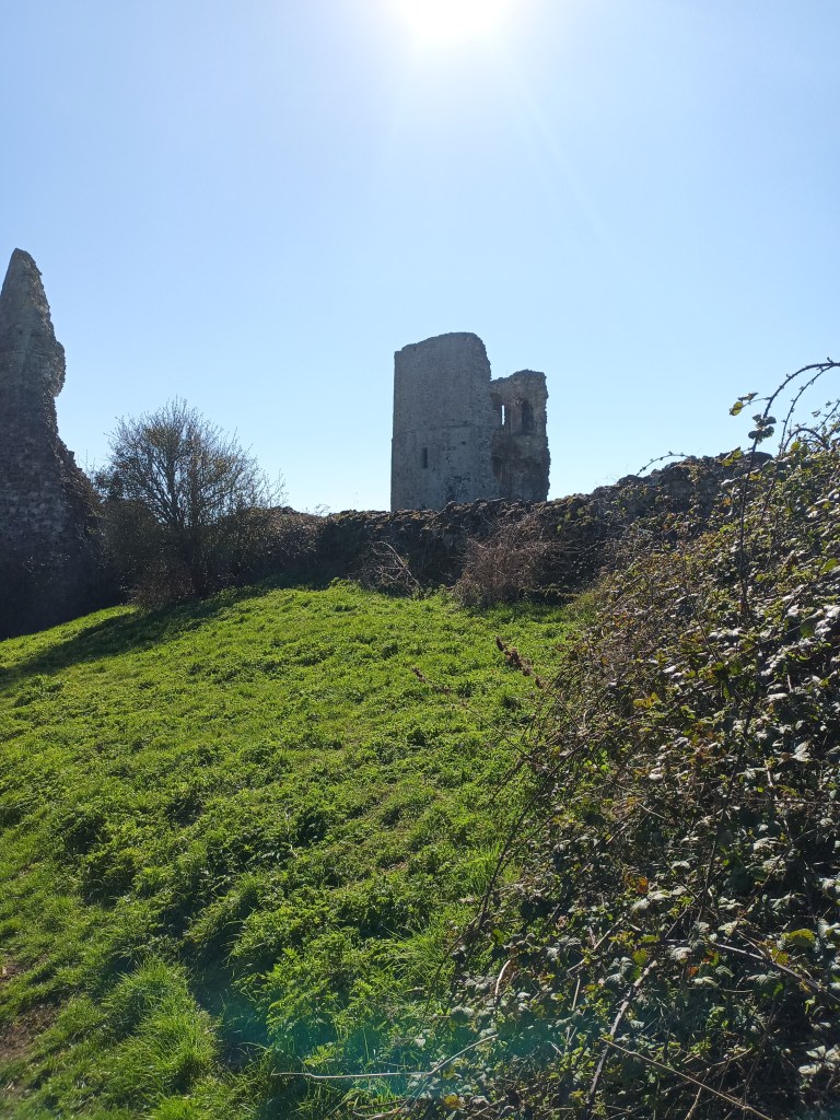Once in Hadleigh I made my way to the Cycle centre and Café where I had a quick slurp of coffee, a slice of Victoria sponge and kept a sausage roll for later in the journey. The Sun was really blinding now and on the other side of the downs the breeze was a bit stronger. Refreshing! Heading down the main path you continue on over a field and pass through a gate leading to a small track which continues on down towards the railway line. From here you can look up and see the castle but you will be closer in a minute as the trail makes you walk up the steep path towards it before you head around the back of the castle.