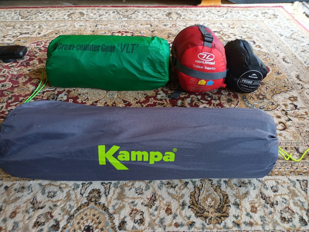 There are two changes to my camping gear. I have gone with the Gram-Counter Gear VLT 1 man tent. This weighs less than 1kg which is about 1.5kg less than the two man tent I lugged around last time. It uses my hiking poles as tent poles and is a single skin tent.