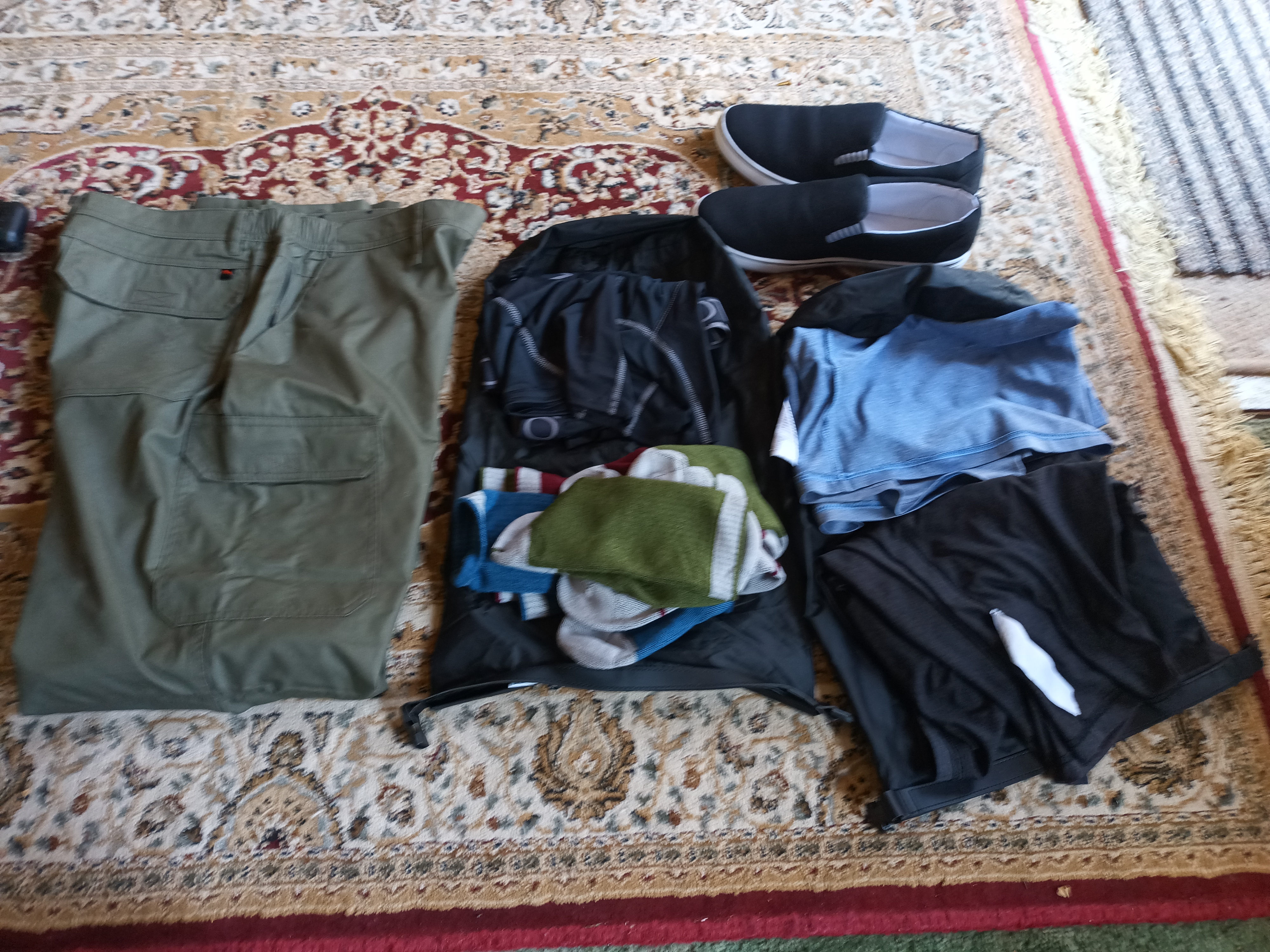 Clothes wise I have a pair of convertible walking trousers and a pair of shorts. I have bought 3 pairs of quick drying breathable boxers and socks. Last time trying to wash and dry the socks and boxers I had was impossible. Along with that I have 3 wick effect tops, a base fleece and a top fleece. All of this is stuffed in a dry bag which doubles as a pillow. I have also bought some cheap canvas shoes to change into when I am staying at motels.