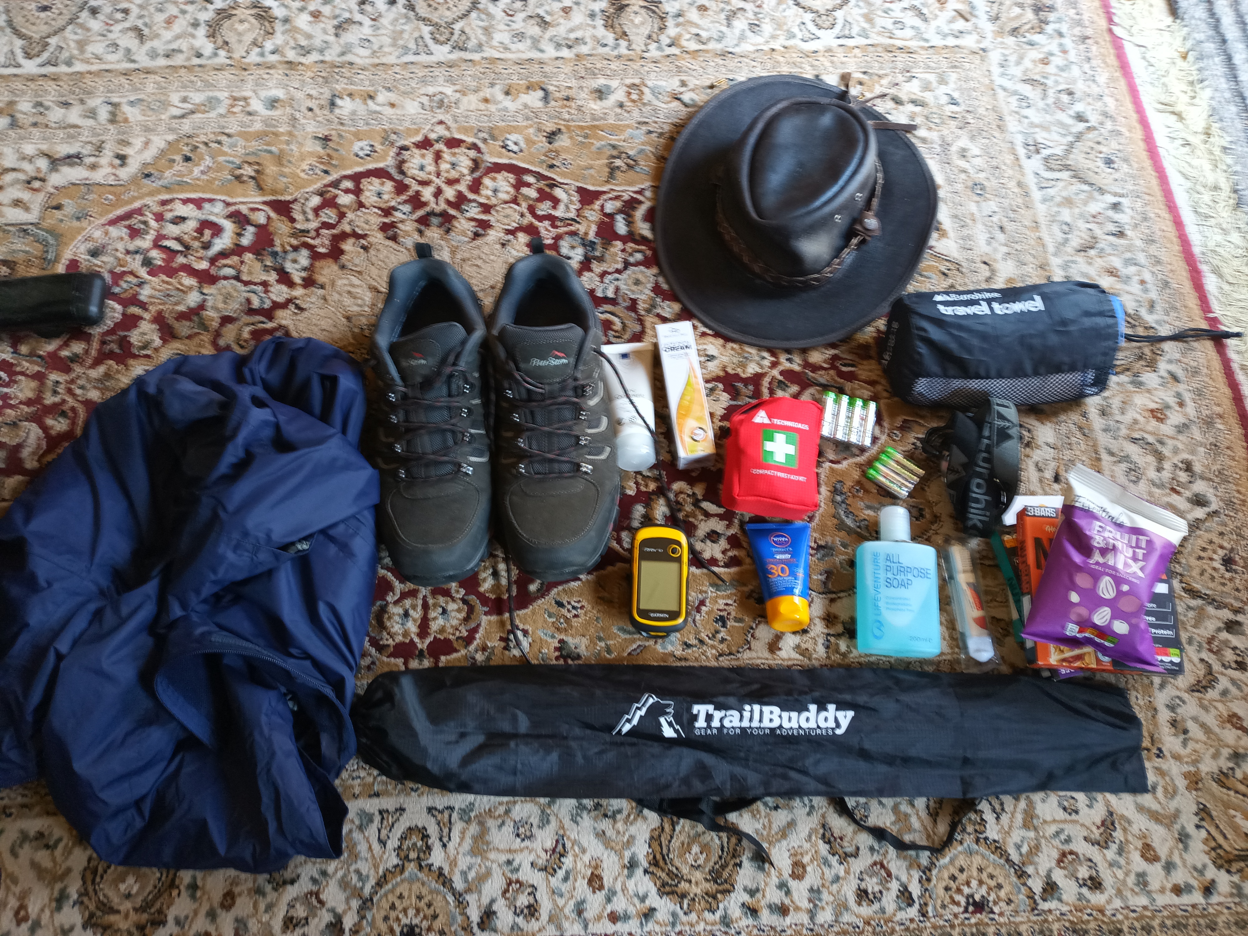 A mac and over trousers as I have seen the forecasts and it looks showery. My walking shoes and TrailBuddy hiking poles. Zinc Oxide for the chaffing! Fungal cream for the feet. Sun screen, soap, travel toothbrush and paste. First Aid kit, batteries, headlight and a travel towel. Some protein bars and fruit and nut mix, may save me if I cannot find anywhere to eat!