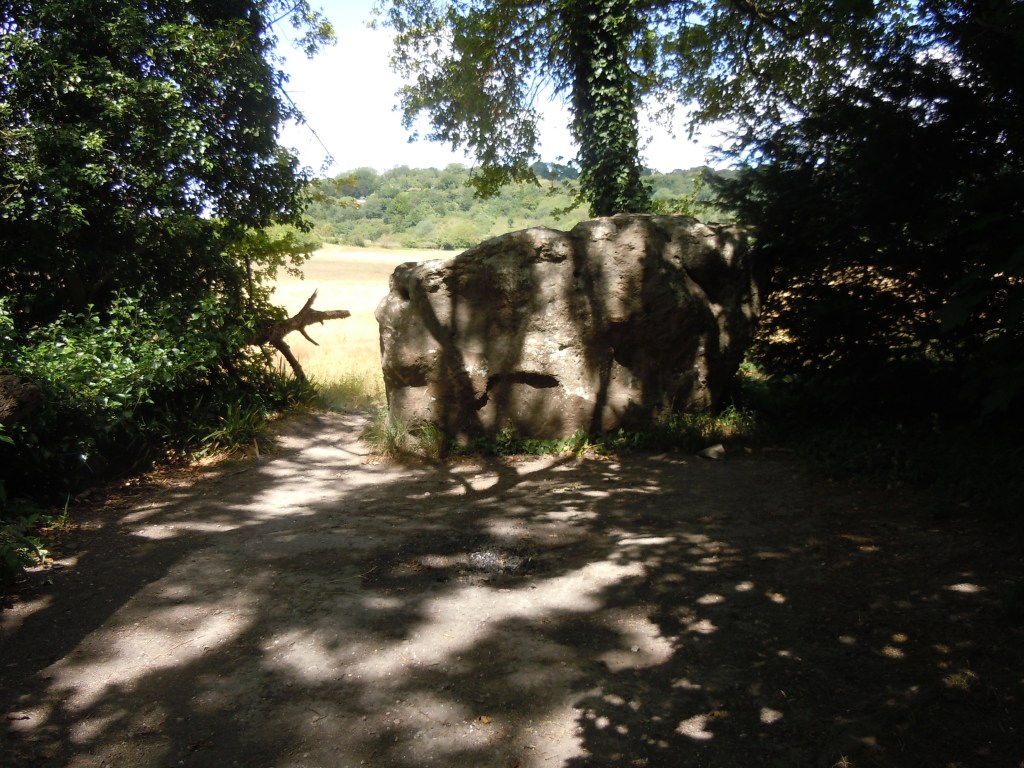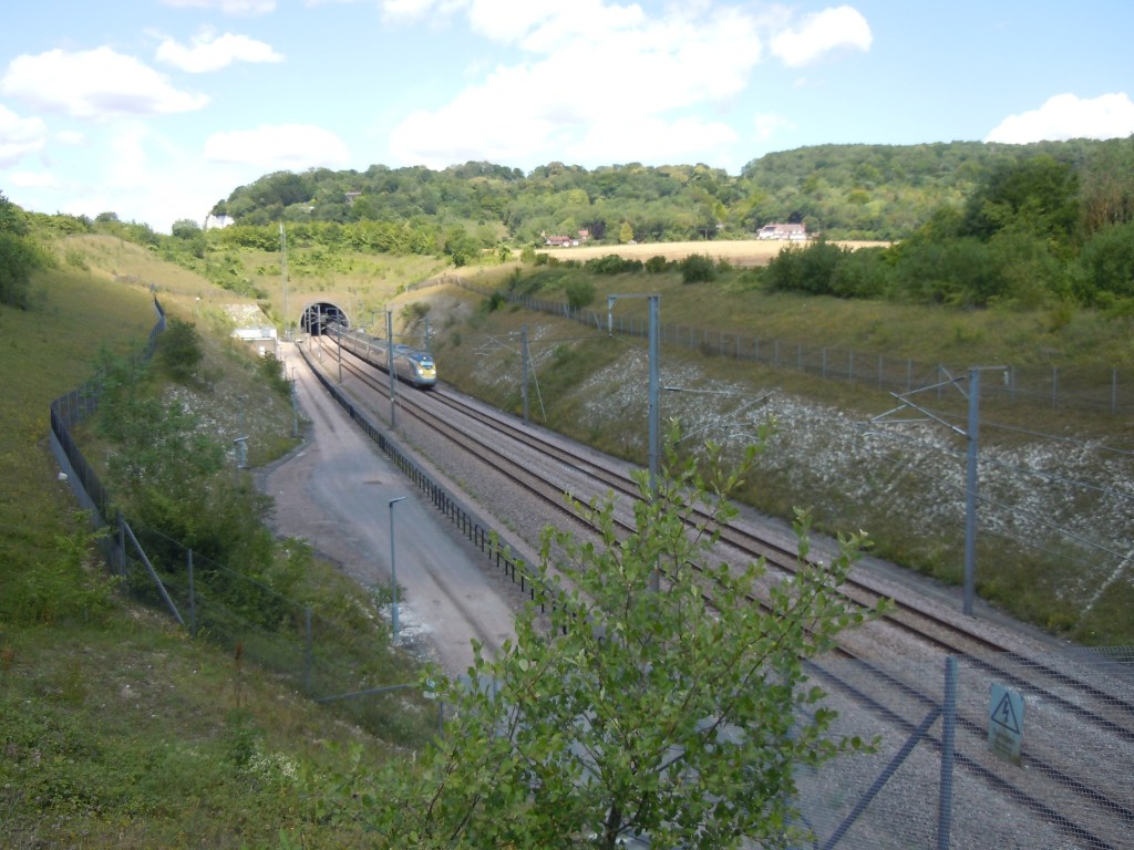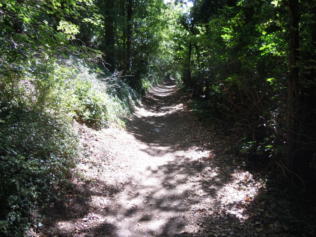 The path then headed down across a busy road and back up again before heading under a busy road and reaching Chatham services where I ate a sandwich and had a coffee as well as buy some supplies. On the way passing an ancient monument called Kit’s Cosy House. From here the trail headed down to a bridge over the Eurostar line again. This time I got lucky as one came out the tunnel. The trail headed up steeply through some woods before heading over fields and through wood again.