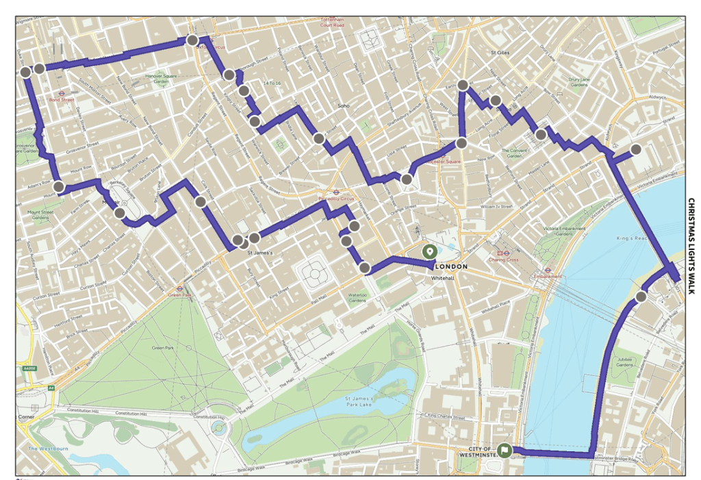 Once we were all gathered together we headed off down Cockspur Street turning onto Pall Mall before a right turn at Waterloo place. The St James Christmas Tree looked spectacular. Continuing up the street with lghts adorning the way we turned right into St James Market to see the ‘Wishing Tree’. This was quite different.