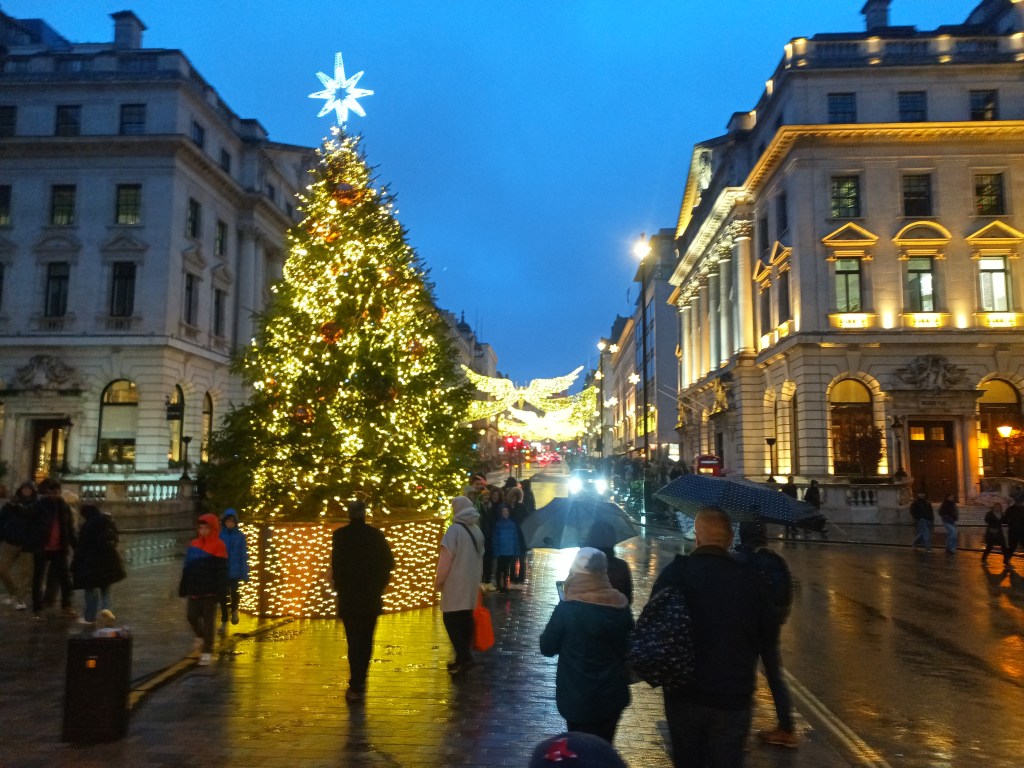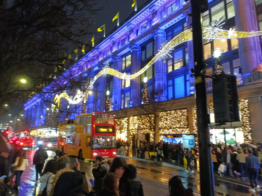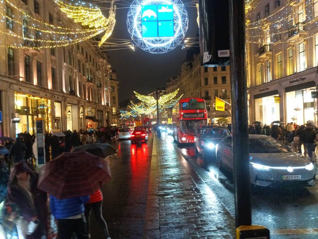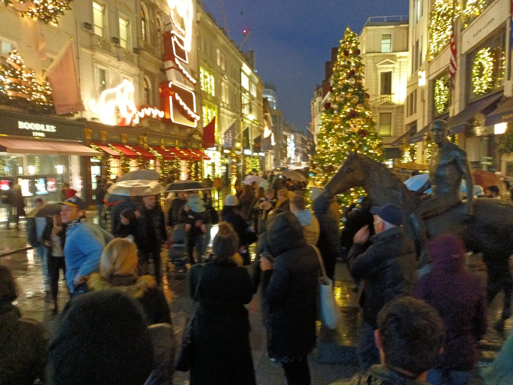 From here we head onto the busiest street, Oxford Street. Selfridges is bedecked with lights and a Disney Castle. Oxford Street looked splendid albeit whilst trying to avoid ninja like umbrella attacks as the rain poured down. At Oxford circus I take a quick picture of Regent Street, thank God we were not going down there.