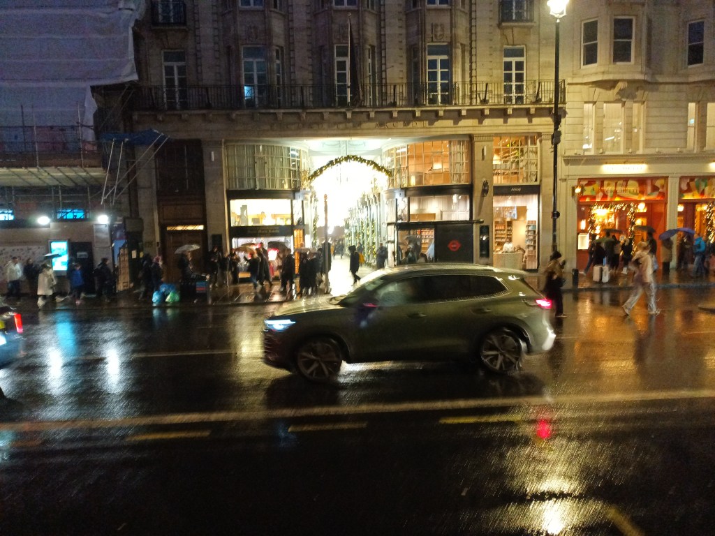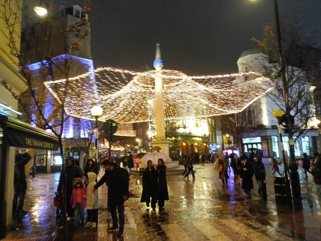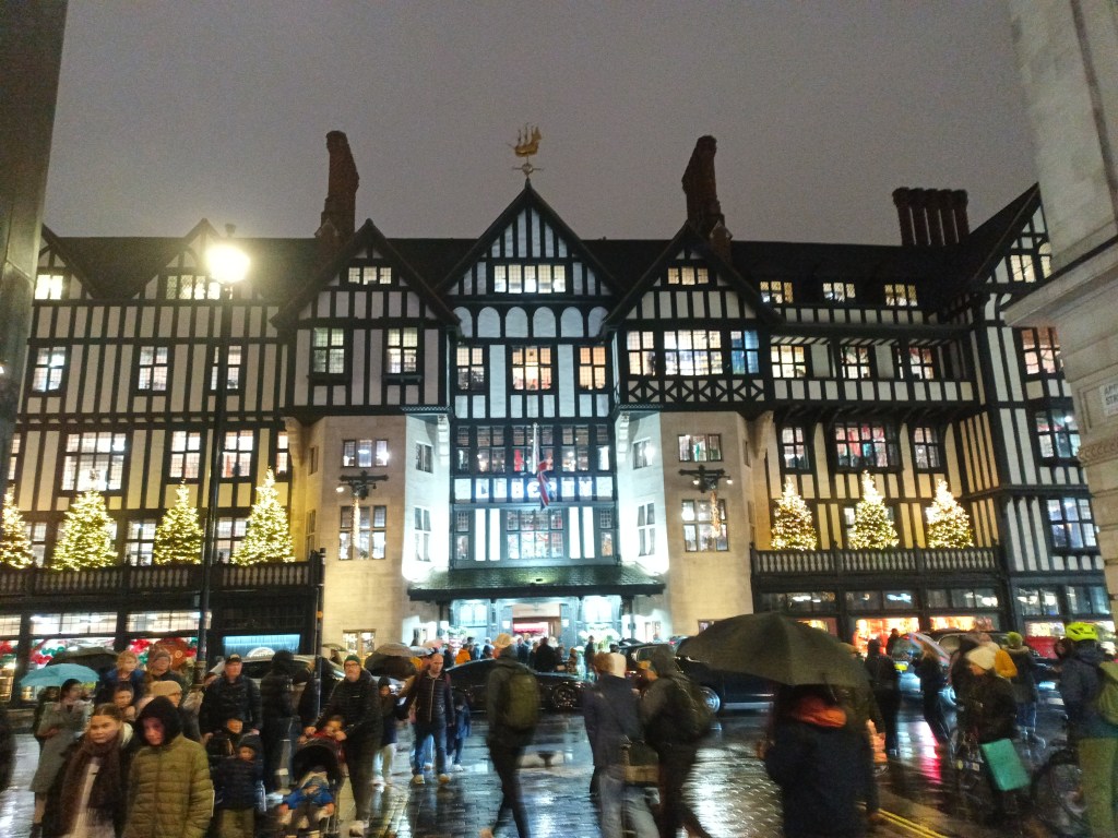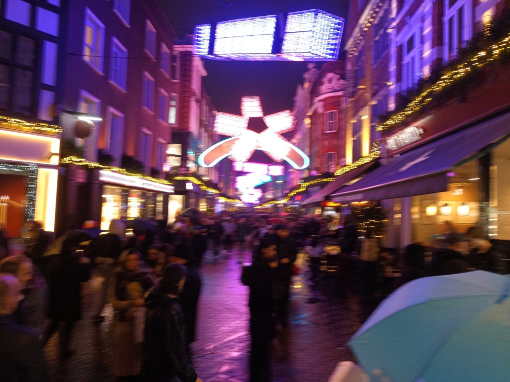 From here we head onto the busiest street, Oxford Street. Selfridges is bedecked with lights and a Disney Castle. Oxford Street looked splendid albeit whilst trying to avoid ninja like umbrella attacks as the rain poured down. At Oxford circus I take a quick picture of Regent Street, thank God we were not going down there.