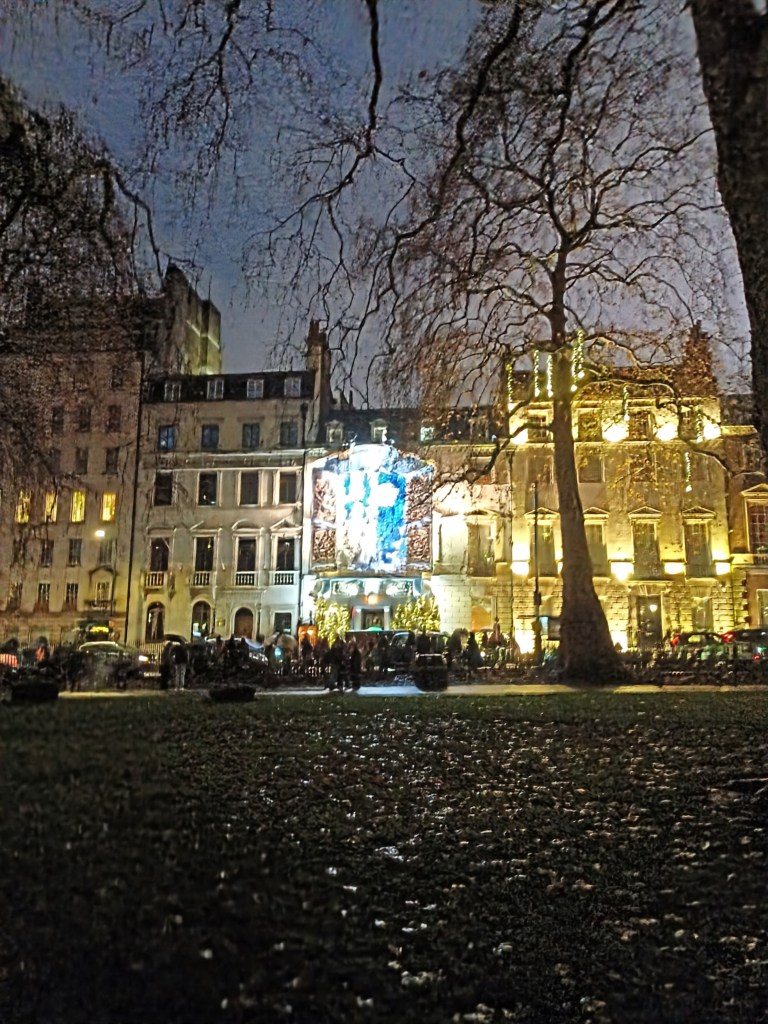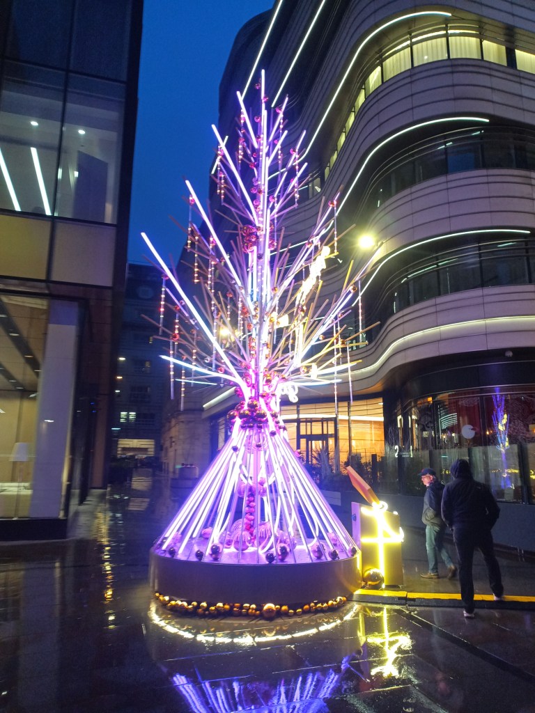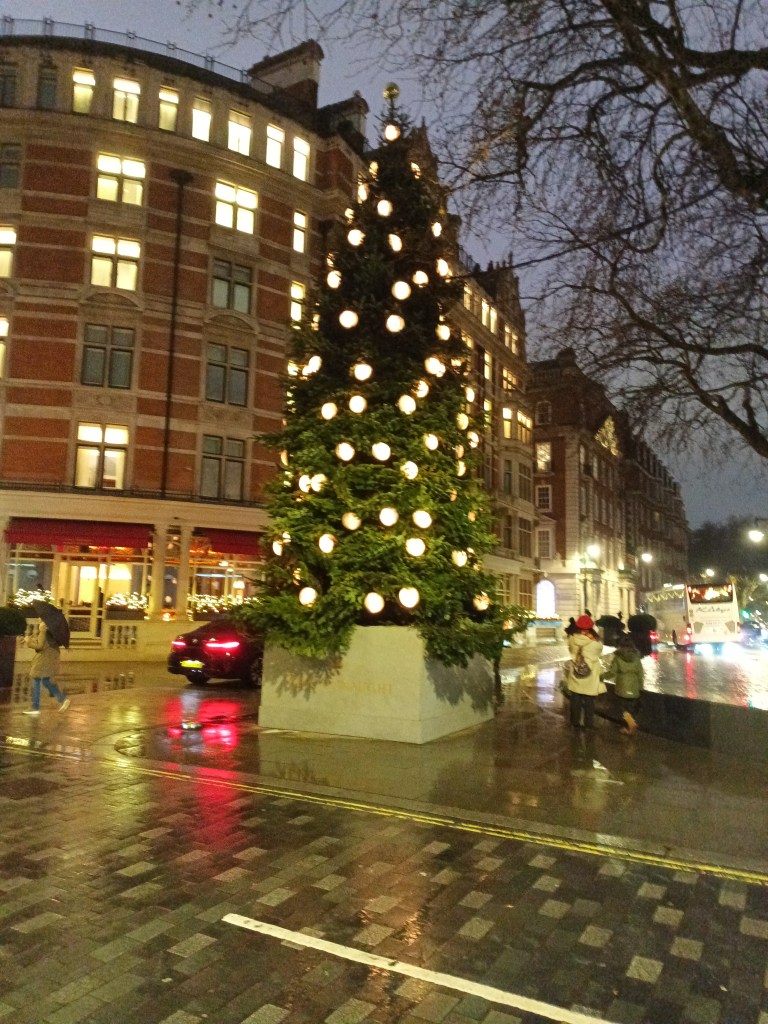 Heading out of the Arcade and onto New Bond Street we admired the lights before heading around and about on towards Berkeley Square. The outside of Annabel’s was done up nicely but we were not on the list so could not get in. Heading north and taking a left we came to The Connaught Christmas Tree. The baubles depicted AI generated faces from all the peoples of the world.