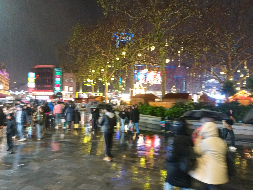 We started off at Trafalgar Square, it had started raining, not good. The yearly tree from Norway wasn’t looking the best and the nativity scene had Jesus born a few days early but never mind.