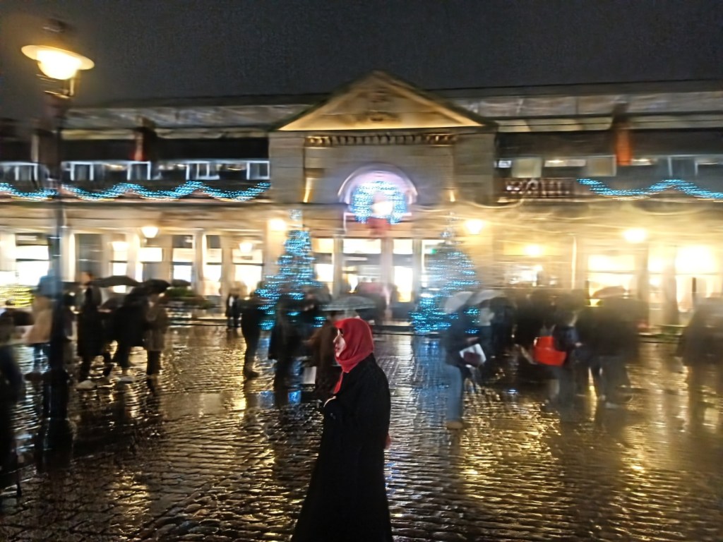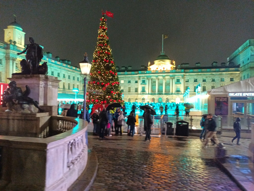 We head through Covent Garden looking at the lights and for a toilet. No joy there. We are pretty soaked now and there wasn’t much left to look at nor much time. We took refuge in the Coal Hole for a drink and the toilet. We decided to miss out the walk back along the other side of the Thames. So finishing up our drinks, we walked passed the Savoy and onto Somerset House where they have a lovely Ice Rink every year.